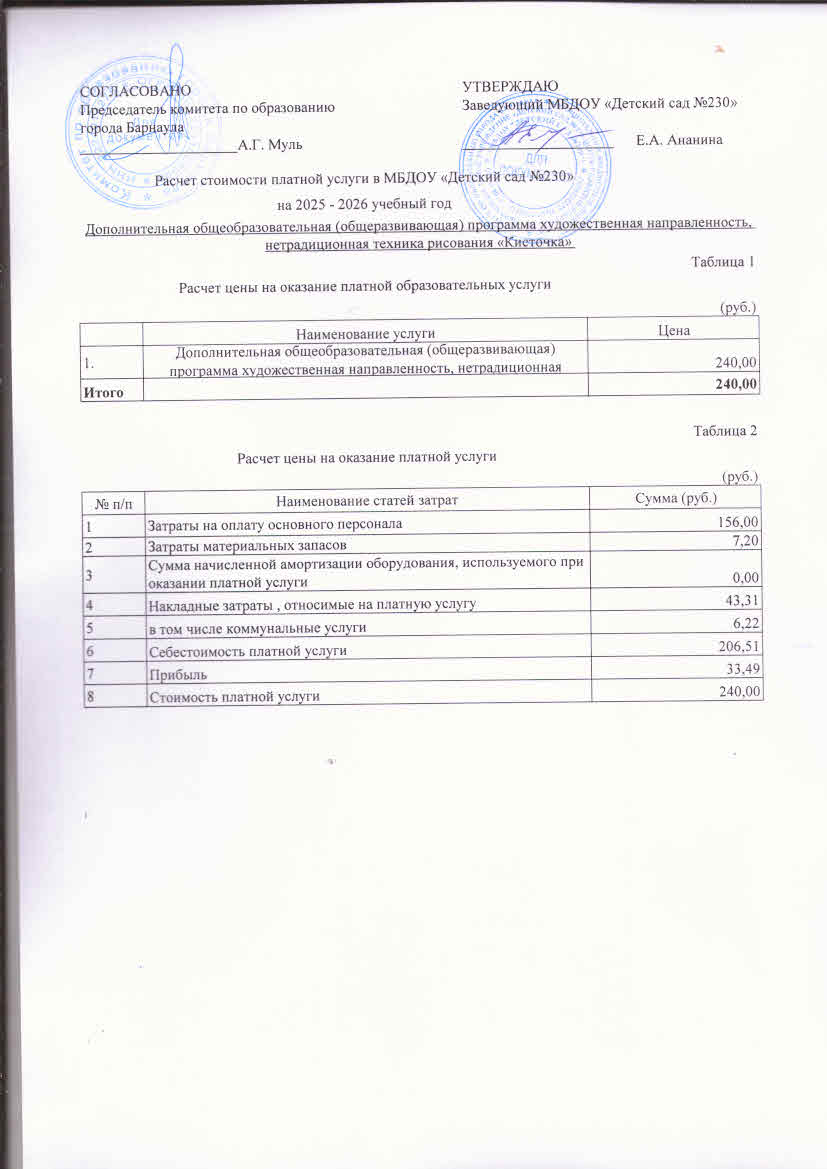 Расчёт стоимости платной услуги “Нетрадиционная техника рисования Кисточка”