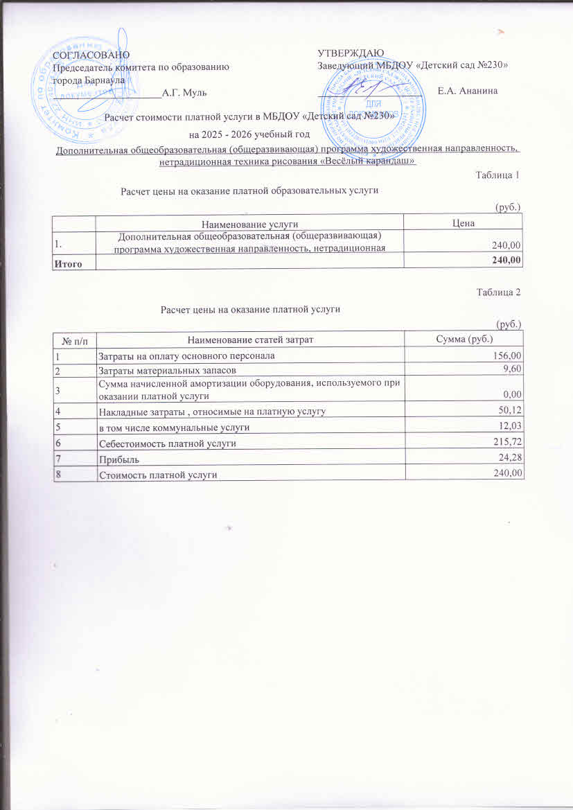 Расчёт стоимости платной услуги “Нетрадиционная техника рисования Весёлый карандаш”