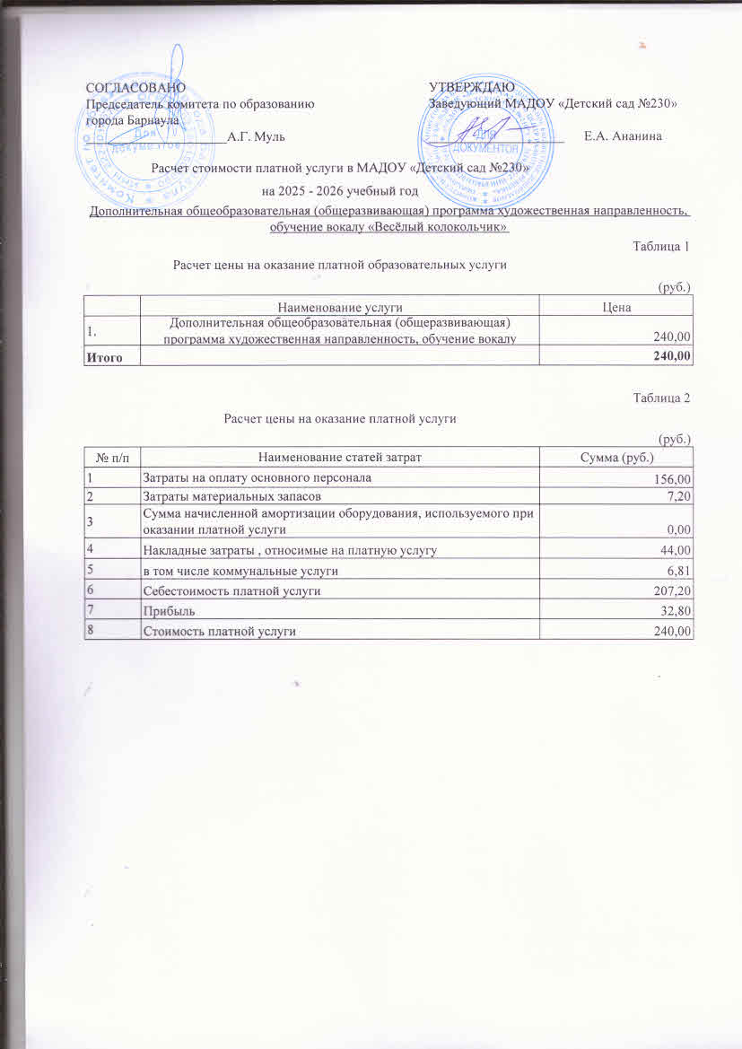 Расчёт стоимости платной услуги “Обучение вокалу Весёлый колокольчик”