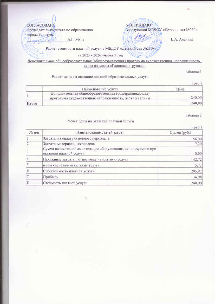 Расчёт стоимости платной услуги “Лепка из глины Глиняная игрушка”
