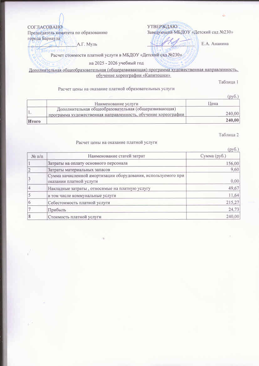 Расчёт стоимости платной услуги “Обучение хореографии Капитошки”