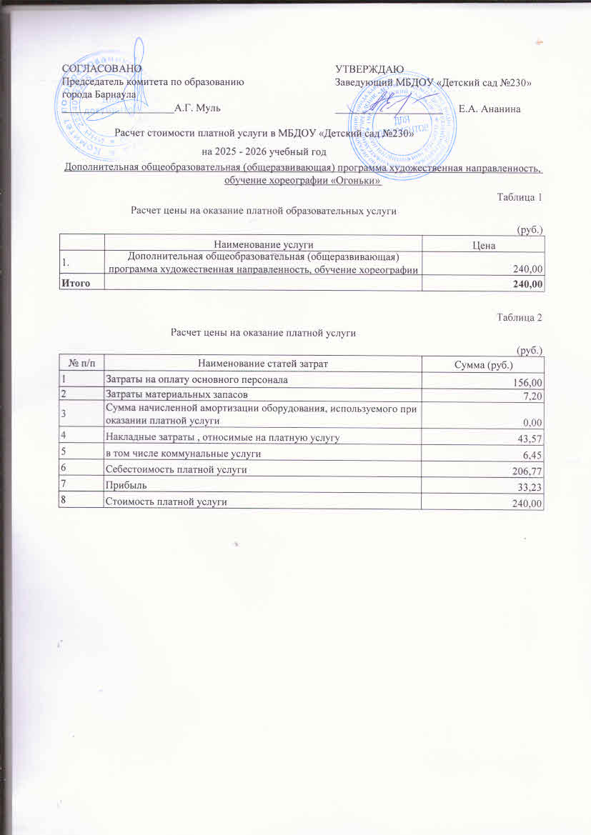 Расчёт стоимости платной услуги “Обучение хореографии Огоньки”