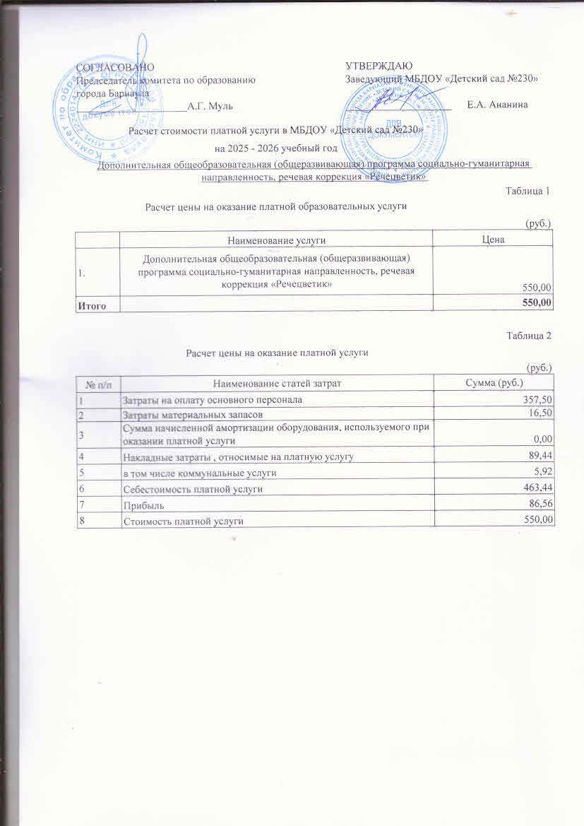 Расчёт стоимости платной услуги “Речевая коррекция Речецветик”