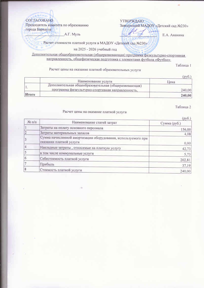 Расчёт стоимости платной услуги “Физическое воспитание на основе футбола”