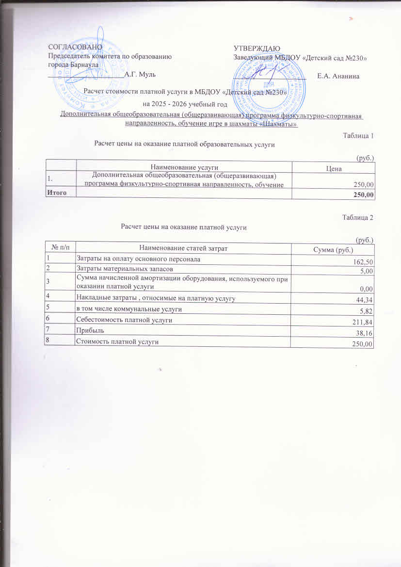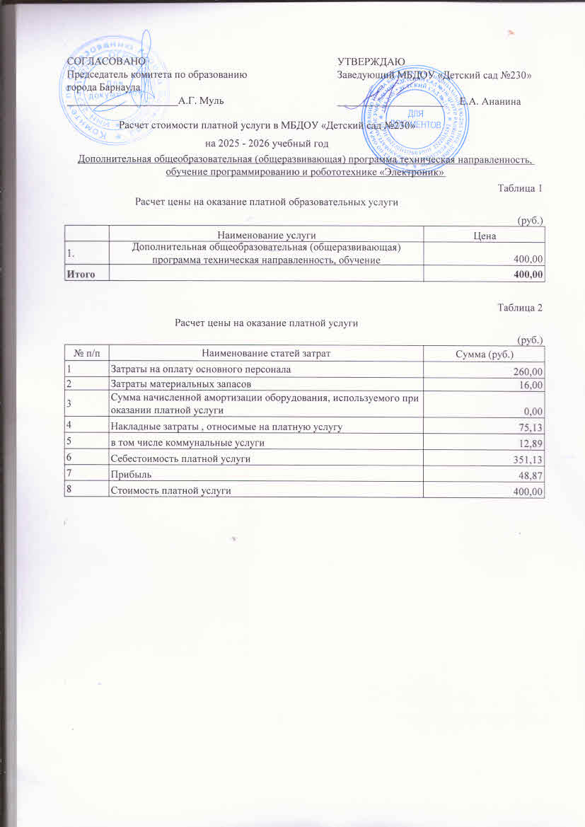 Расчет стоимости платных услуг на 2025-2026 учебный год
